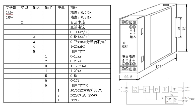 CAS系列電量變送器是將被測交直流電流、電壓等信號轉(zhuǎn)換成按線性比例輸出直流電流、電壓并隔離的設(shè)備。
