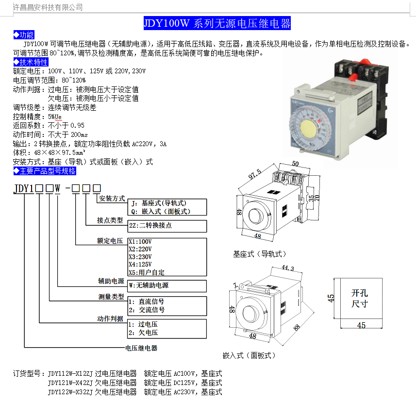 JDY100W可調(diào)節(jié)電壓繼電器(無輔助電源),適用于高低壓線路、變壓器,直流系統(tǒng)及用電設(shè)備,作為單相電壓檢測及控制設(shè)備??烧{(diào)節(jié)范圍80~120%,調(diào)節(jié)及檢測精度高,是高低壓系統(tǒng)簡便可靠的電壓繼電保護。
