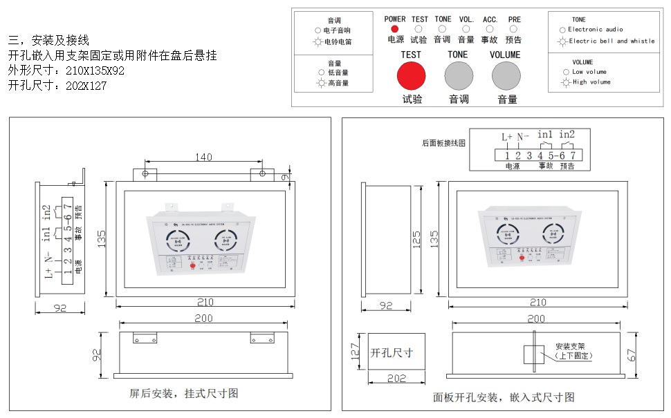 指示燈:6個(gè)LED指示,電源、試驗(yàn)、音調(diào)、音量、事故、預(yù)告
